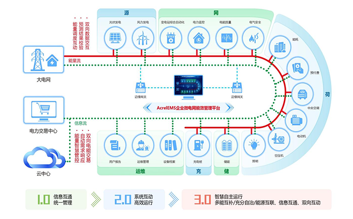簡介:1.概述 通過在源、網、荷、儲、充的各個關鍵節(jié)點安裝監(jiān)測、分析、保護、治理裝置, 通過高性能邊緣計算網關采集數據并上傳至企業(yè)微網平臺。平臺根據新的電網價格、 用電負荷、電網調度指令等情況,調整各系統(tǒng)控制策略并遠程下發(fā),使企業(yè)微電網始終高效穩(wěn)定運行, 降低企業(yè)用電成本,實現能源互聯、信息互動。 2.應用場所 適用于各行業(yè)企業(yè)內部微電網管理系統(tǒng)的新建、擴建、改建等項目。 3.平臺結構 3.平臺功能 安科瑞AcrelEMS企業(yè)微電網能效管理平臺融合了電力監(jiān)控、電氣安全、照明控制、能源管控、充電樁運營管理、分布式光伏監(jiān)測、儲能管理、設備臺賬、運維管理等功能,通過一個平臺、一個APP整體的對企業(yè)用電進行集中監(jiān)控、統(tǒng)一調度、統(tǒng)一運維,并且根據當地供電部門錯峰避峰計劃提前為企業(yè)制定錯峰避峰方案和預警,滿足企業(yè)